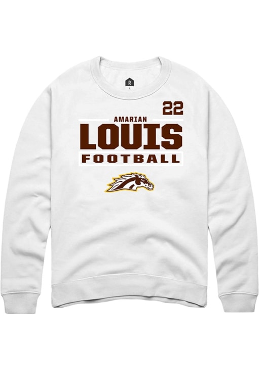 Support your Western Michigan Broncos and favorite Amarian Louis in this Western Michigan Broncos Mens White Football NIL Stacked Box Player Crew. This Crew Sweatshirt features a NIL graphic, and is sure to stand out in the stadium. Perfect to wear on game day or any day!