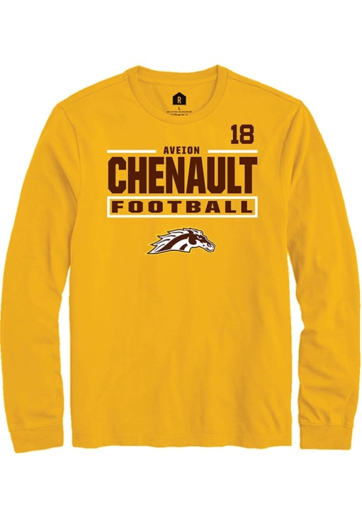 Embrace the spirit of your favorite player in this Western Michigan Broncos Gold Football NIL Stacked Box Aveion Chenault Long Sleeve Player Tee! This Player T Shirt features a NIL graphic, so everyone will know you cheer for WMU Broncos, Aveion Chenault! This is the perfect Broncos Player Tee for game days. Go Broncos!