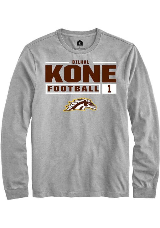 Show your Western Michigan Broncos spirit in this WMU Broncos Grey T Shirt! This WMU Broncos Football NIL Stacked Box Long Sleeve T Shirt makes a great layer for cooler nights cheering on the Broncos. Featuring a custom graphic with player's name and number, this Western Michigan Broncos Long Sleeve Tee is an essential addition for every fan. Go Broncos!