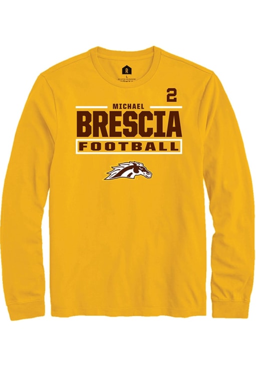 Embrace the spirit of your favorite player in this Western Michigan Broncos Gold Football NIL Stacked Box Michael Brescia Long Sleeve Player Tee! This Player T Shirt features a NIL graphic, so everyone will know you cheer for WMU Broncos, Michael Brescia! This is the perfect Broncos Player Tee for game days. Go Broncos!