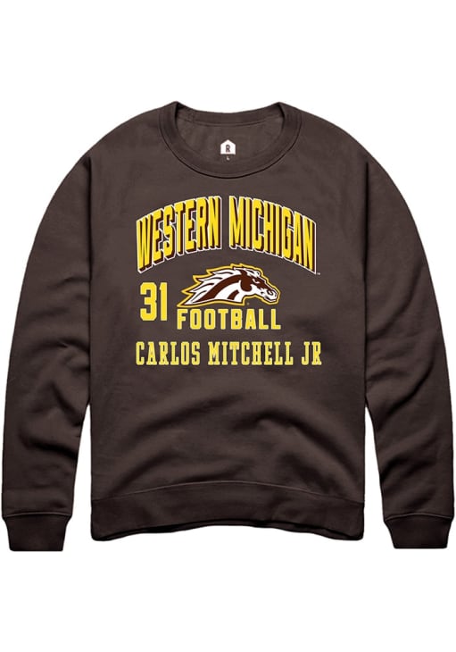 Support your Western Michigan Broncos and favorite Carlos Mitchell Jr in this Western Michigan Broncos Mens Brown Football NIL Arch Logo Player Crew. This Crew Sweatshirt features a NIL graphic, and is sure to stand out in the stadium. Perfect to wear on game day or any day!