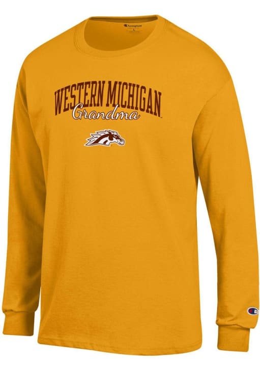 Show your Western Michigan Broncos spirit in this WMU Broncos Gold T Shirt! This WMU Broncos Grandma Script Jersey Long Sleeve T Shirt makes a great layer for cooler nights cheering on the Broncos. Featuring a printed team graphic on front chest, this Western Michigan Broncos Long Sleeve Tee is an essential addition for every fan. Go Broncos!