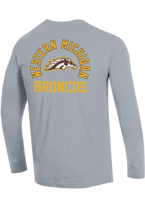 Show your Western Michigan Broncos spirit in this WMU Broncos Grey T Shirt! This WMU Broncos Stadium Three Hits Long Sleeve T Shirt makes a great layer for cooler nights cheering on the Broncos. Featuring a screen print team graphic on front left chest, left sleeve and back, this Western Michigan Broncos Long Sleeve Tee is an essential addition for every fan. Go Broncos!