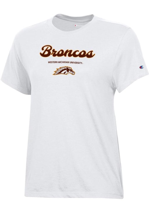 Display your team spirit with this remarkable Western Michigan Broncos White Script Mascot Logo Core Short Sleeve T-Shirt! The WMU Broncos Short Sleeve Tee showcases a center front screen print team name and logo that truly sets it apart. Stand out from the crowd and proudly declare your allegiance to the Broncos with this exceptional White WMU Broncos T-Shirt. Go Broncos!