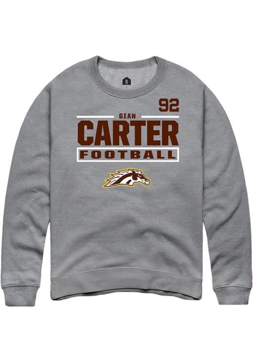 Support your Western Michigan Broncos and favorite Gian Carter in this Western Michigan Broncos Mens Grey Football NIL Stacked Box Player Crew. This Crew Sweatshirt features a NIL graphic, and is sure to stand out in the stadium. Perfect to wear on game day or any day!