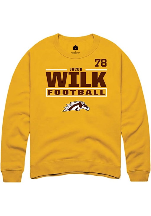 Support your Western Michigan Broncos and favorite Jacob Wilk in this Western Michigan Broncos Mens Gold Football NIL Stacked Box Player Crew. This Crew Sweatshirt features a NIL graphic, and is sure to stand out in the stadium. Perfect to wear on game day or any day!