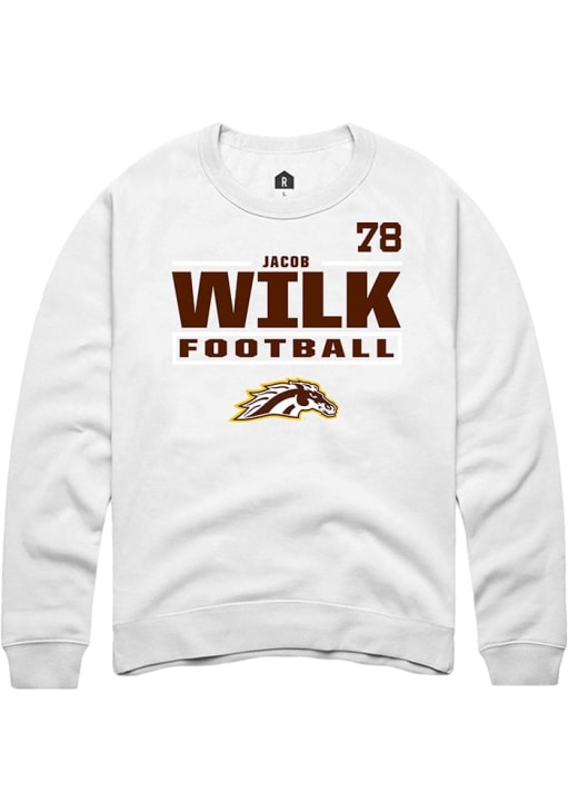Support your Western Michigan Broncos and favorite Jacob Wilk in this Western Michigan Broncos Mens White Football NIL Stacked Box Player Crew. This Crew Sweatshirt features a NIL graphic, and is sure to stand out in the stadium. Perfect to wear on game day or any day!