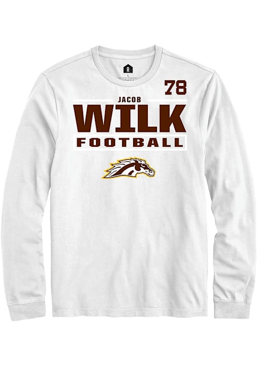Embrace the spirit of your favorite player in this Western Michigan Broncos White Football NIL Stacked Box Jacob Wilk Long Sleeve Player Tee! This Player T Shirt features a NIL graphic, so everyone will know you cheer for WMU Broncos, Jacob Wilk! This is the perfect Broncos Player Tee for game days. Go Broncos!
