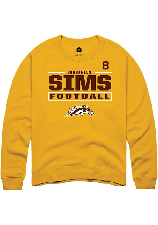Support your Western Michigan Broncos and favorite Jarvarius Sims in this Western Michigan Broncos Mens Gold Football NIL Stacked Box Player Crew. This Crew Sweatshirt features a NIL graphic, and is sure to stand out in the stadium. Perfect to wear on game day or any day!