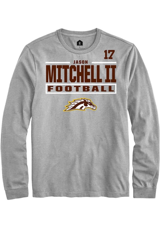 Embrace the spirit of your favorite player in this Western Michigan Broncos Grey Football NIL Stacked Box Jason Mitchell II Long Sleeve Player Tee! This Player T Shirt features a NIL graphic, so everyone will know you cheer for WMU Broncos, Jason Mitchell II! This is the perfect Broncos Player Tee for game days. Go Broncos!