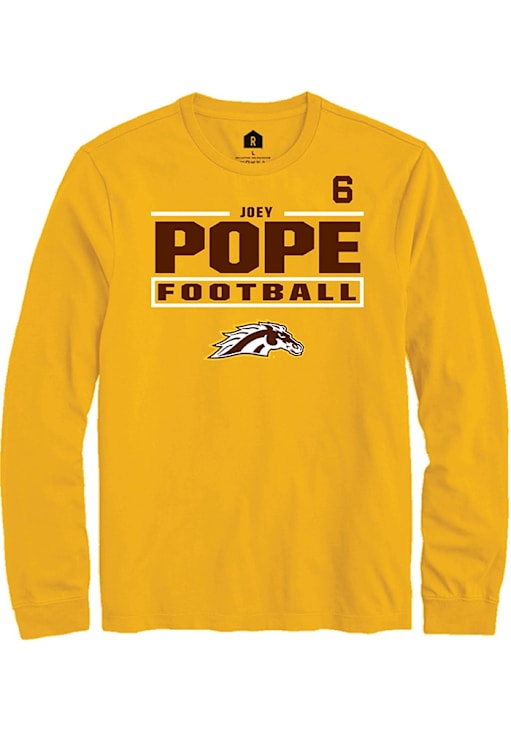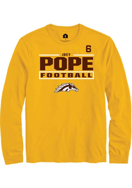 Embrace the spirit of your favorite player in this Western Michigan Broncos Gold Football NIL Stacked Box Joey Pope Long Sleeve Player Tee! This Player T Shirt features a NIL graphic, so everyone will know you cheer for WMU Broncos, Joey Pope! This is the perfect Broncos Player Tee for game days. Go Broncos!