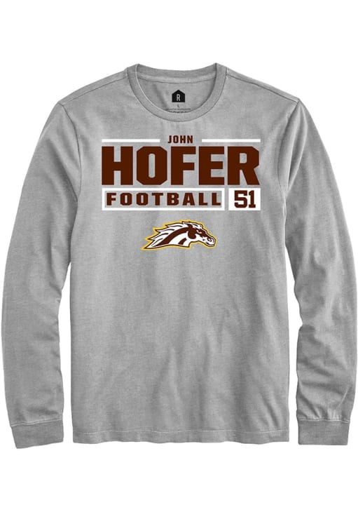 Show your Western Michigan Broncos spirit in this WMU Broncos Grey T Shirt! This WMU Broncos Football NIL Stacked Box Long Sleeve T Shirt makes a great layer for cooler nights cheering on the Broncos. Featuring a custom graphic with player's name and number, this Western Michigan Broncos Long Sleeve Tee is an essential addition for every fan. Go Broncos!