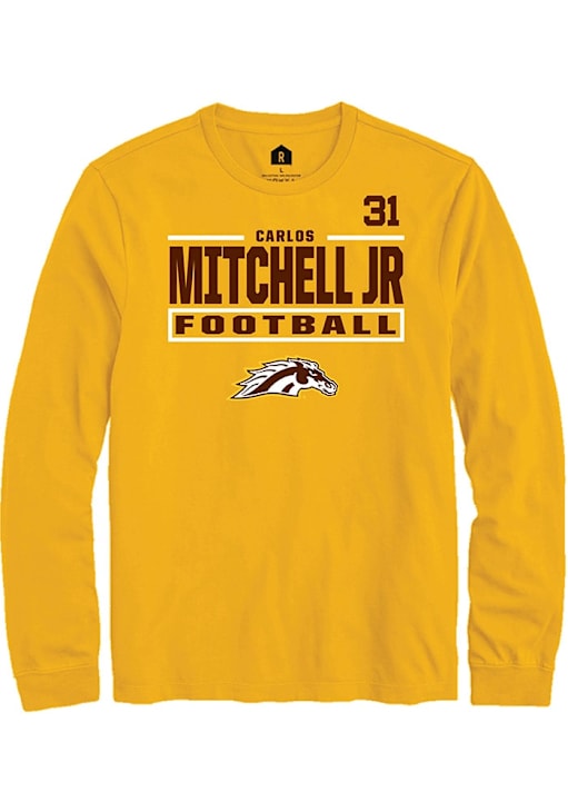 Embrace the spirit of your favorite player in this Western Michigan Broncos Gold Football NIL Stacked Box Carlos Mitchell Jr Long Sleeve Player Tee! This Player T Shirt features a NIL graphic, so everyone will know you cheer for WMU Broncos, Carlos Mitchell Jr! This is the perfect Broncos Player Tee for game days. Go Broncos!