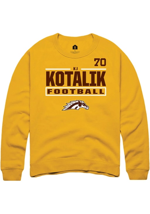 Support your Western Michigan Broncos and favorite KJ Kotalik in this Western Michigan Broncos Mens Gold Football NIL Stacked Box Player Crew. This Crew Sweatshirt features a NIL graphic, and is sure to stand out in the stadium. Perfect to wear on game day or any day!