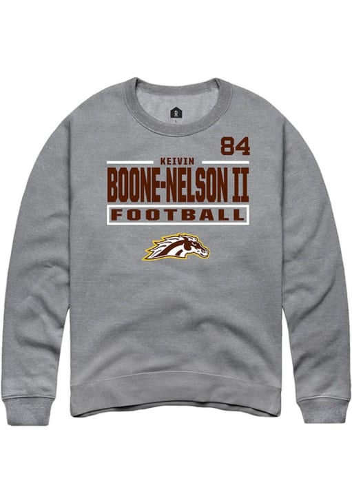 Support your Western Michigan Broncos and favorite Keivin Boone-Nelson II in this Western Michigan Broncos Mens Grey Football NIL Stacked Box Player Crew. This Crew Sweatshirt features a NIL graphic, and is sure to stand out in the stadium. Perfect to wear on game day or any day!