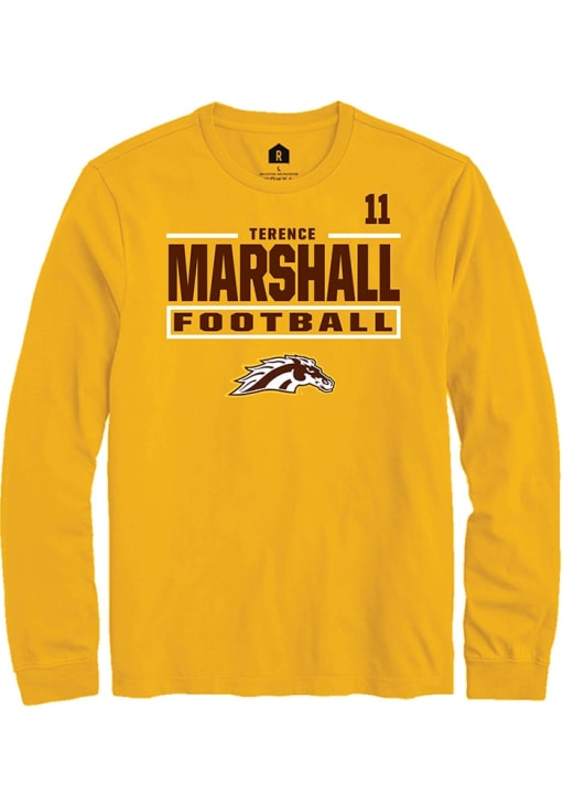 Embrace the spirit of your favorite player in this Western Michigan Broncos Gold Football NIL Stacked Box Terence Marshall Long Sleeve Player Tee! This Player T Shirt features a NIL graphic, so everyone will know you cheer for WMU Broncos, Terence Marshall! This is the perfect Broncos Player Tee for game days. Go Broncos!
