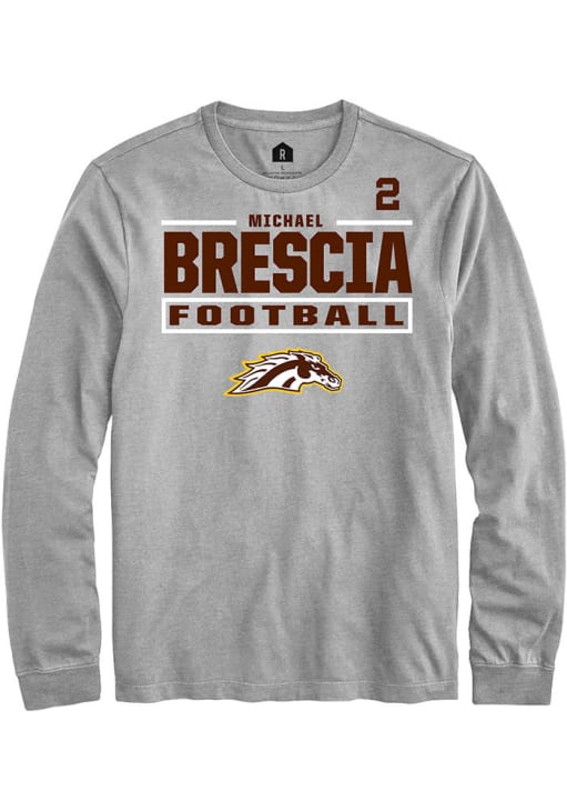 Embrace the spirit of your favorite player in this Western Michigan Broncos Grey Football NIL Stacked Box Michael Brescia Long Sleeve Player Tee! This Player T Shirt features a NIL graphic, so everyone will know you cheer for WMU Broncos, Michael Brescia! This is the perfect Broncos Player Tee for game days. Go Broncos!