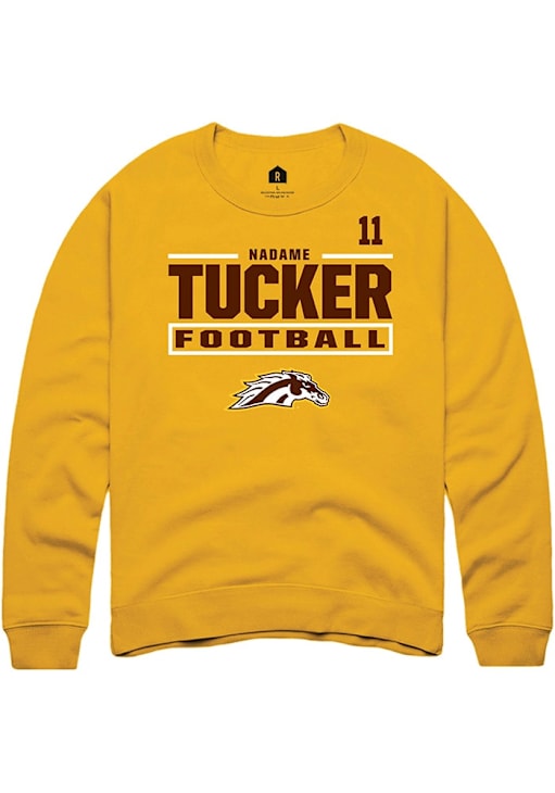 Support your Western Michigan Broncos and favorite Nadame Tucker in this Western Michigan Broncos Mens Gold Football NIL Stacked Box Player Crew. This Crew Sweatshirt features a NIL graphic, and is sure to stand out in the stadium. Perfect to wear on game day or any day!