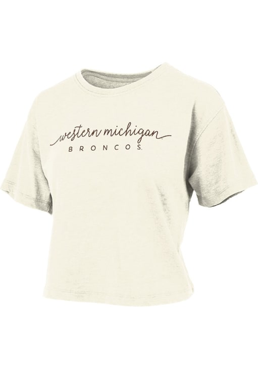 Display your team spirit with this remarkable Western Michigan Broncos Ivory Vintage Design Short Sleeve T-Shirt! The WMU Broncos Short Sleeve Tee showcases a screen print team name on center chest that truly sets it apart. Stand out from the crowd and proudly declare your allegiance to the Broncos with this exceptional Ivory WMU Broncos T-Shirt. Go Broncos!