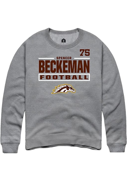 Support your Western Michigan Broncos and favorite Spencer Beckeman in this Western Michigan Broncos Mens Grey Football NIL Stacked Box Player Crew. This Crew Sweatshirt features a NIL graphic, and is sure to stand out in the stadium. Perfect to wear on game day or any day!