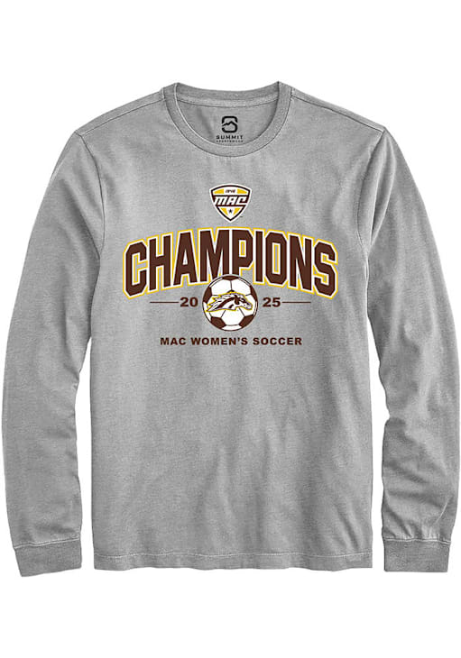 Show your Western Michigan Broncos spirit in this WMU Broncos Grey T Shirt! This WMU Broncos 2025 MAC Soccer Champions Long Sleeve T Shirt makes a great layer for cooler nights cheering on the Broncos. Featuring a championship team logo, this Western Michigan Broncos Long Sleeve Tee is an essential addition for every fan. Go Broncos!
