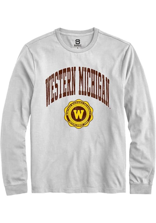 Show your Western Michigan Broncos spirit in this WMU Broncos White T Shirt! This WMU Broncos Arch Seal Long Sleeve T Shirt makes a great layer for cooler nights cheering on the Broncos. Featuring a digitally printed graphic, this Western Michigan Broncos Long Sleeve Tee is an essential addition for every fan. Go Broncos!