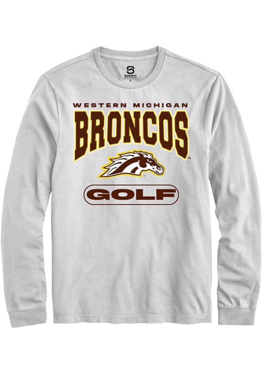 Show your Western Michigan Broncos spirit in this WMU Broncos White T Shirt! This WMU Broncos Golf Long Sleeve T Shirt makes a great layer for cooler nights cheering on the Broncos. Featuring a digitally printed graphic, this Western Michigan Broncos Long Sleeve Tee is an essential addition for every fan. Go Broncos!