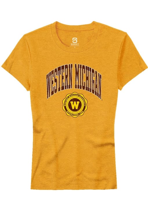 Display your team spirit with this remarkable Western Michigan Broncos Gold Arch Seal Short Sleeve T-Shirt! The WMU Broncos Short Sleeve Tee showcases a digitally printed graphic that truly sets it apart. Stand out from the crowd and proudly declare your allegiance to the Broncos with this exceptional Gold WMU Broncos T-Shirt. Go Broncos!