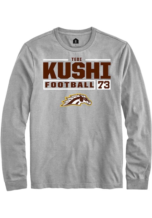 Show your Western Michigan Broncos spirit in this WMU Broncos Grey T Shirt! This WMU Broncos Football NIL Stacked Box Long Sleeve T Shirt makes a great layer for cooler nights cheering on the Broncos. Featuring a custom graphic with player's name and number, this Western Michigan Broncos Long Sleeve Tee is an essential addition for every fan. Go Broncos!