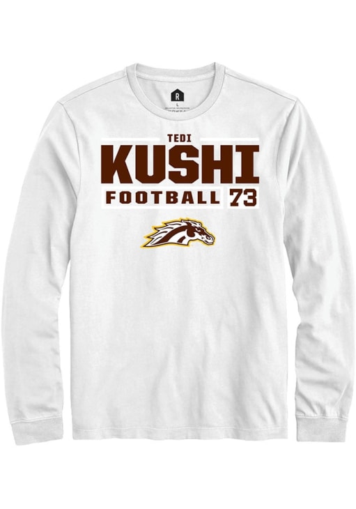 Show your Western Michigan Broncos spirit in this WMU Broncos White T Shirt! This WMU Broncos Football NIL Stacked Box Long Sleeve T Shirt makes a great layer for cooler nights cheering on the Broncos. Featuring a custom graphic with player's name and number, this Western Michigan Broncos Long Sleeve Tee is an essential addition for every fan. Go Broncos!