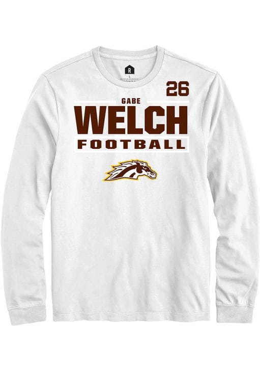 Embrace the spirit of your favorite player in this Western Michigan Broncos White Football NIL Stacked Box Gabe Welch Long Sleeve Player Tee! This Player T Shirt features a NIL graphic, so everyone will know you cheer for WMU Broncos, Gabe Welch! This is the perfect Broncos Player Tee for game days. Go Broncos!
