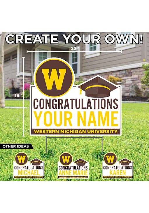 Product Details Product Details First Name ONLY.Approximatley 19"x22"Cut to Shape Weatherproof PlasticMetal Stakes IncludedFull Color PrintCustomized Graduation Sign with your name! Officially Licensed Western Michigan Broncos Custom Grad Yard Sign will let everyone know you root for the Broncos proudly. This Yard Sign features a weather resistant material.