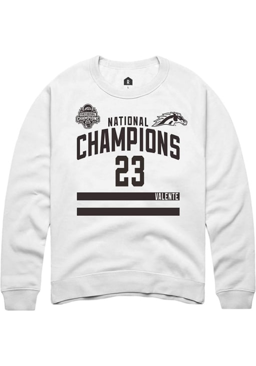 Support your Western Michigan Broncos and favorite Liam Valente in this Western Michigan Broncos Mens White NIL 2025 National Champions Shirzee Player Crew. This Crew Sweatshirt features a NIL graphic, and is sure to stand out in the stadium. Perfect to wear on game day or any day!
