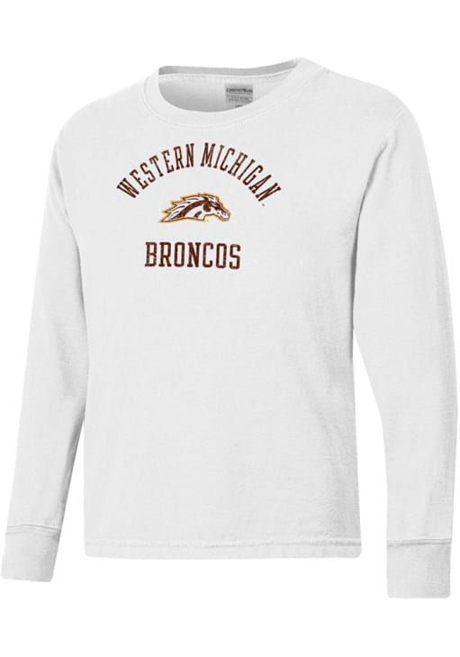 Your little Broncos fan a will love supporting the Western Michigan Broncos in this White Long Sleeve T-Shirt. This Arch Mascot Garment Dyed T-Shirt features a screen print team graphic.