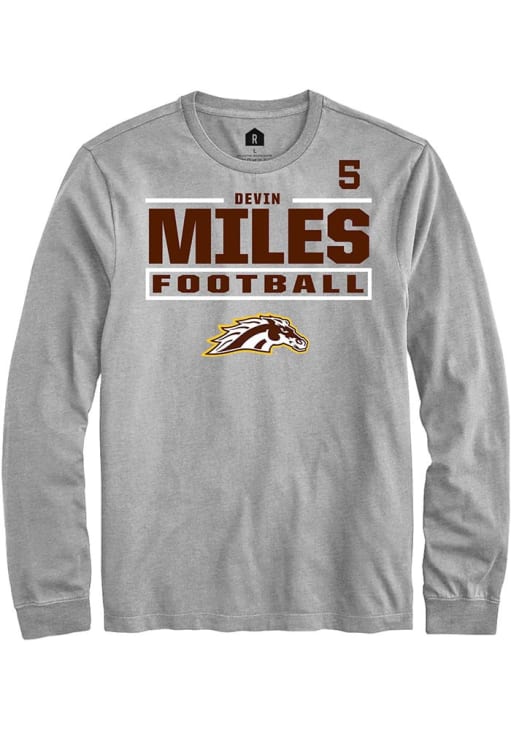 Show your Western Michigan Broncos spirit in this WMU Broncos Grey T Shirt! This WMU Broncos Football NIL Stacked Box Long Sleeve T Shirt makes a great layer for cooler nights cheering on the Broncos. Featuring a custom graphic with player's name and number, this Western Michigan Broncos Long Sleeve Tee is an essential addition for every fan. Go Broncos!