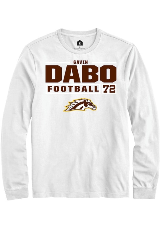 Show your Western Michigan Broncos spirit in this WMU Broncos White T Shirt! This WMU Broncos Football NIL Stacked Box Long Sleeve T Shirt makes a great layer for cooler nights cheering on the Broncos. Featuring a custom graphic with player's name and number, this Western Michigan Broncos Long Sleeve Tee is an essential addition for every fan. Go Broncos!