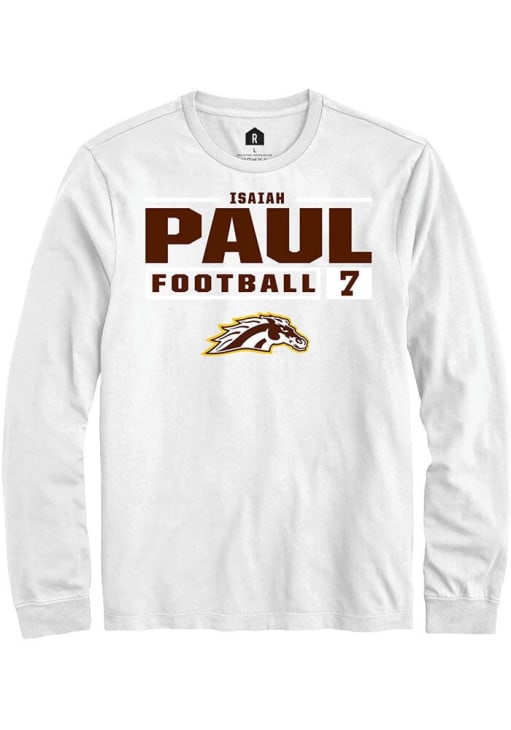 Show your Western Michigan Broncos spirit in this WMU Broncos White T Shirt! This WMU Broncos Football NIL Stacked Box Long Sleeve T Shirt makes a great layer for cooler nights cheering on the Broncos. Featuring a custom graphic with player's name and number, this Western Michigan Broncos Long Sleeve Tee is an essential addition for every fan. Go Broncos!