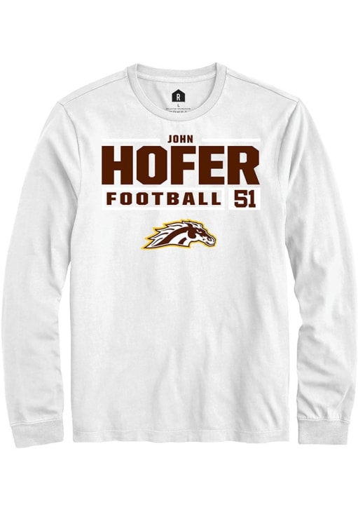 Show your Western Michigan Broncos spirit in this WMU Broncos White T Shirt! This WMU Broncos Football NIL Stacked Box Long Sleeve T Shirt makes a great layer for cooler nights cheering on the Broncos. Featuring a custom graphic with player's name and number, this Western Michigan Broncos Long Sleeve Tee is an essential addition for every fan. Go Broncos!